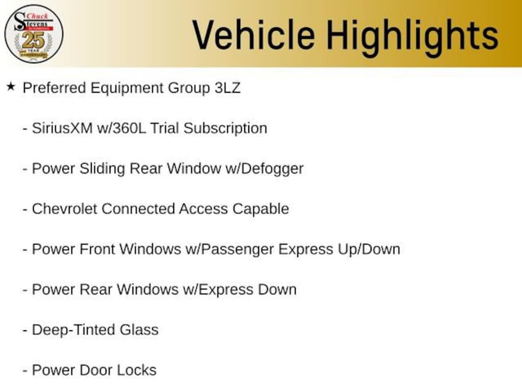 120-Volt Bed Mounted Power Outlet, 120-Volt Interior Power Outlet, 15 Diagonal Multicolor Head-Up Display, 170 Amp Alternator, 6 Rectangular Chromed Tubular Assist Steps, Alloy wheels, Auto-Dimming Inside Rear-View Mirror, Bed View Camera w/2 Trailer Camera Provisions, Black Chevytec Spray-On Bedliner, Bluetooth® For Phone, Chevrolet Connected Access Capable, Chrome Door Handles, Chrome Mirror Caps, Color-Keyed Carpeting Floor Covering, Compass, Deep-Tinted Glass, Electric Rear-Window Defogger, Front Carpeted Floor Mats, Front Chrome Recovery Hooks, Front LED Fog Lamps, Front Rain-Sensing Wipers, Heated 2nd Row Outboard Seats, Heated Steering Wheel, Hill Descent Control, Hitch Guidance w/Hitch View, In-Vehicle Trailering App System, Keyless Open & Start, LED Cargo Area Lighting, Manual Tilt & Telescoping Steering Column, Memory seat, Off-Road Suspension, OnStar Services Capable, Polished Exhaust Tip, Power Door Locks, Power Front Windows w/Driver Express Up/Down, Power Front Windows w/Passenger Express Up/Down, Power Rear Windows w/Express Down, Power Sliding Rear Window w/Defogger, Preferred Equipment Group 3LZ, Premium audio system: Chevrolet Infotainment 3 Premium, Push Button Start, Pwr Up/Down Tailgate Function w/Pwr Lock & Release, Rear Camera Mirror, Rear Carpeted Floor Mats, Rear Cross Traffic Alert, Rear Wheelhouse Liners, Remote Vehicle Starter System, SiriusXM w/360L Trial Subscription, Standard Tailgate, Steering Wheel Audio Controls, Suspension Package, Technology Package, Trailer Camera Provisions, Ultrasonic Front & Rear Park Assist, Unauthorized Entry Theft-Deterrent System, Universal Home Remote, Up-Level Rear Seat w/Storage Package, Wheels: 20 8-Spoke Polished, Wi-Fi Hotspot Capable, Wireless Charging, Wireless Phone Projection, Wrapped Steering Wheel, Z71 Off-Road Package.