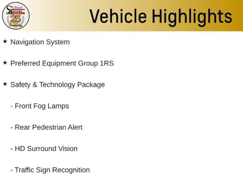 All-Weather Floor Liners (LPO), Alloy wheels, Automatic temperature control, Cargo Mat, Convenience Package III, Emergency communication system: OnStar and Chevrolet connected services capable, Floor Liner Package (LPO), Front dual zone A/C, Front Fog Lamps, Front Passenger 2-Way Power Lumbar Seat Adjuster, Front Passenger 8-Way Power Seat Adjuster, Fully automatic headlights, HD Surround Vision, Heated Rear Outboard Seating Positions, Memory Settings, Navigation System, Power Liftgate, Preferred Equipment Group 1RS, Premium audio system: Chevrolet Infotainment 3, Radio: 11.3 Diagonal Advanced Color LCD Display, Rear Pedestrian Alert, Remote keyless entry, Safety & Technology Package, Second Row All-Weather Mat (LPO), SiriusXM w/360L Trial Subscription, Steering wheel mounted audio controls, Traffic Sign Recognition, Ventilated Driver Seat, Ventilated Front Passenger Seat, Wheels: 19 Carbon Flash Metallic Aluminum.