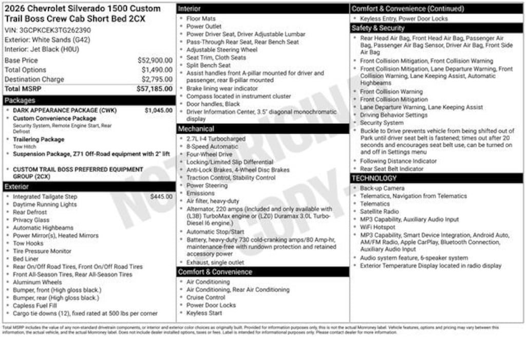 Welcome to Chuck Stevens Chevrolet located on HWY 31 South, Bay Minette Alabama. We are home of The Lifetime Powertrain Program. A Lifetime Powertrain Warranty at no additional cost. Grab a great deal with our low-price guarantee on this 2026 Chevrolet Silverado 1500 while we still have it. The White Sands 2026 Chevrolet Silverado 1500 with Jet Black Cloth interior is a superb choice.Recent Arrival! 2026 Chevrolet Silverado 1500 Custom Trail Boss White Sands 4D Crew Cab Custom Trail Boss 2.7L I4 Turbocharged DOHC 16V LEV3-SULEV30 310hp 4WD 8-Speed AutomaticCOMPLIMENTARY DELIVERY PROGRAM is a convenient service available to our clients 6 days a week, anywhere within a 50-mile radius. Allow one of our Chevrolet Product Specialists to help set up all your personal functions from the comfort of your home or office!LIFETIME POWERTRAIN PROGRAM is included at no additional charge for all vehicles that have less than 80,000 miles. It is one of the most comprehensive powertrain warranty programs on the market. See dealer for details.. Price includes: $1000 - Chevrolet Select Market Bonus Cash. Exp. 04/30/2026 $2000 - Chevrolet Consumer Cash Program. Exp. 04/30/2026 $500 - GM First Responder Cash Allowance Program. Exp. 01/04/2027 $500 - GM Rewards Card Sales Sign Up and Spend Offer. Exp. 06/30/2026