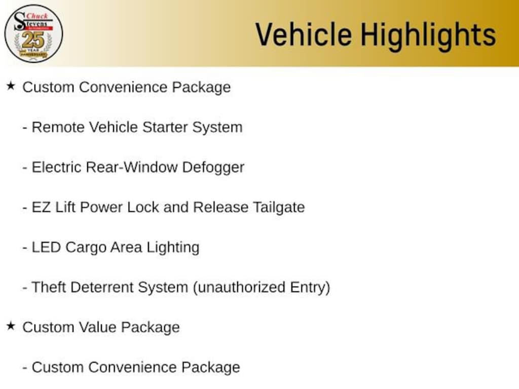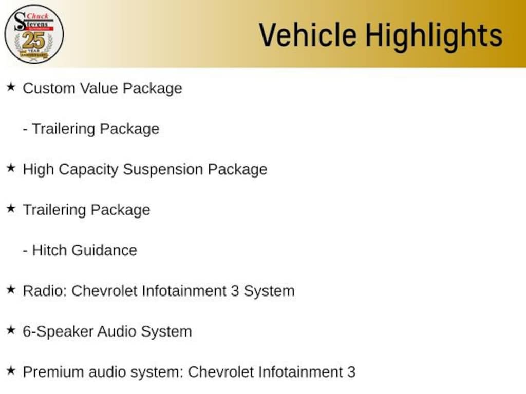 The Custom Convenience Package and Custom Value Package add a wealth of premium features, including a premium audio system, remote vehicle starter, and an array of advanced safety technologies like Automatic Emergency Braking, Forward Collision Alert, and Lane Keep Assist. The High Capacity Suspension Package and Trailering Package ensure this Silverado is ready to handle your toughest jobs and adventures with ease.
