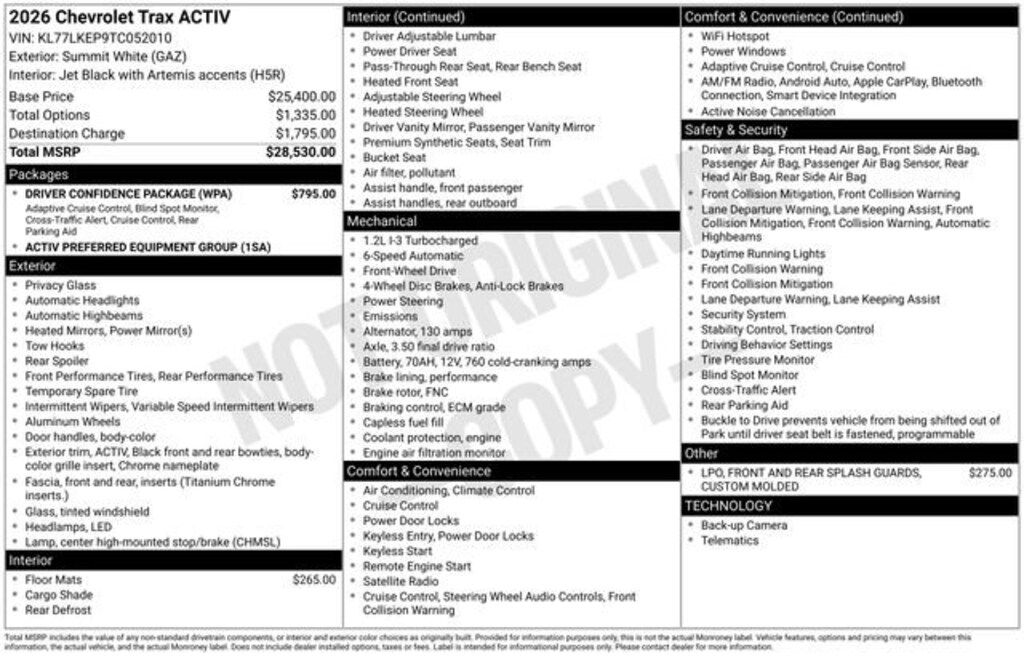Welcome to Chuck Stevens Chevrolet located on HWY 31 South, Bay Minette Alabama. We are home of The Lifetime Powertrain Program. A Lifetime Powertrain Warranty at no additional cost. Grab a great deal with our low-price guarantee on this 2026 Chevrolet Trax while we still have it. The Summit White 2026 Chevrolet Trax with Jet Black With Artemis Accents Premium Synthetic interior is an outstanding choice.Recent Arrival! 2026 Chevrolet Trax ACTIV Summit White 4D Sport Utility ACTIV ECOTEC 1.2L Turbo FWD 6-Speed Automatic 28/32 City/Highway MPGCOMPLIMENTARY DELIVERY PROGRAM is a convenient service available to our clients 6 days a week, anywhere within a 50-mile radius. Allow one of our Chevrolet Product Specialists to help set up all your personal functions from the comfort of your home or office!LIFETIME POWERTRAIN PROGRAM is included at no additional charge for all vehicles that have less than 80,000 miles. It is one of the most comprehensive powertrain warranty programs on the market. See dealer for details.. Price includes: $500 - Chevrolet Consumer Cash Program. Exp. 04/30/2026 $500 - GM First Responder Cash Allowance Program. Exp. 01/04/2027 $500 - GM Rewards Card Sales Sign Up and Spend Offer. Exp. 06/30/2026