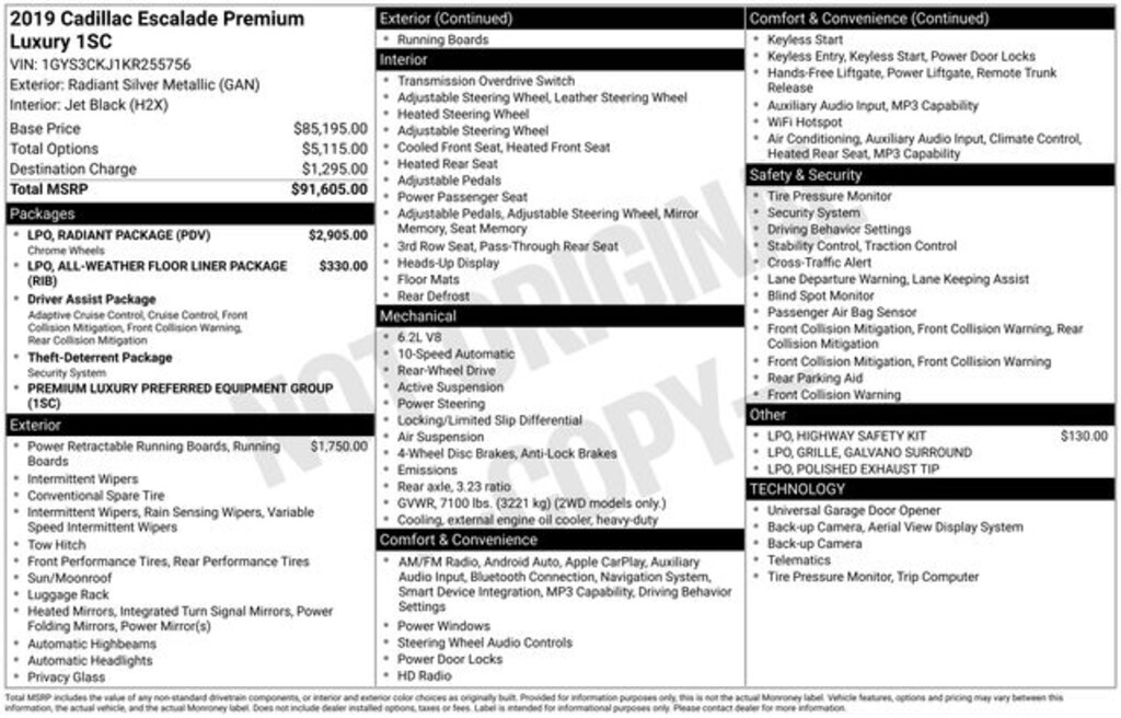 2019 Cadillac Escalade Premium Luxury 4D Sport Utility Premium Luxury Radiant Silver Metallic RWD 6.2L V8 10-Speed Automatic with Overdrive