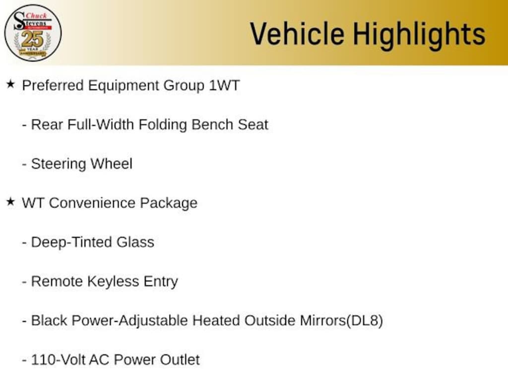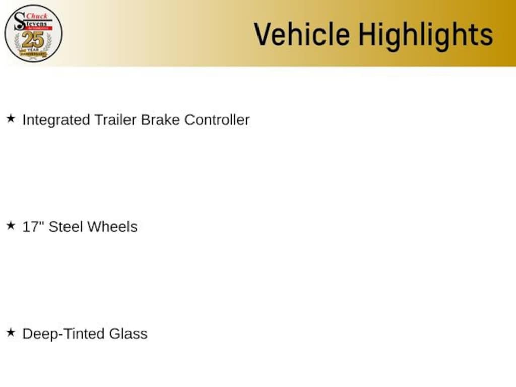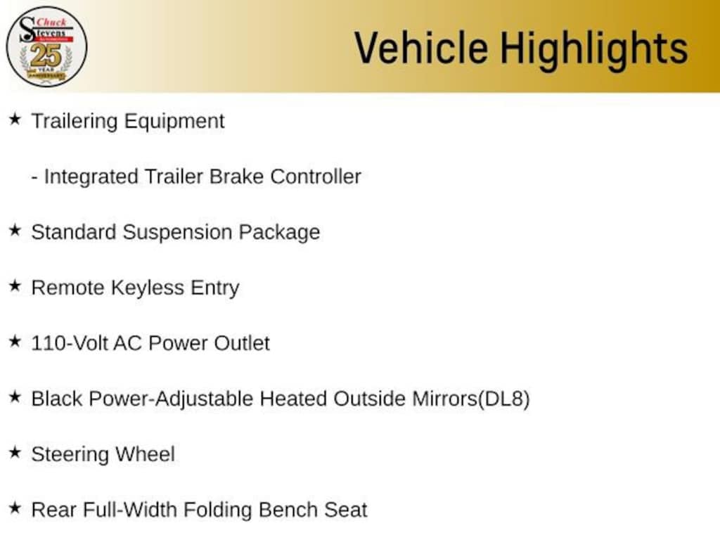 110-Volt AC Power Outlet, 17 Steel Wheels, Black Power-Adjustable Heated Outside Mirrors(DL8), Deep-Tinted Glass, Integrated Trailer Brake Controller, Preferred Equipment Group 1WT, Rear Full-Width Folding Bench Seat, Remote Keyless Entry, Standard Suspension Package, Steering Wheel, Trailering Equipment, WT Convenience Package.