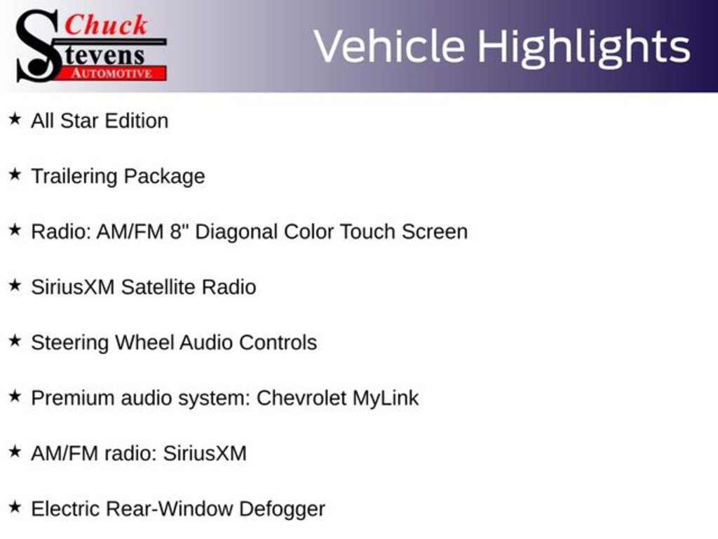 The Silverado's spacious and well-appointed interior provides a comfortable and premium driving experience. Heated front bucket seats, dual-zone automatic climate control, and a Chevrolet MyLink infotainment system with navigation and an 8-inch touchscreen keep you connected and in command. The All Star Edition also adds valuable features like a remote vehicle starter, rear window defogger, and 110-volt power outlet.