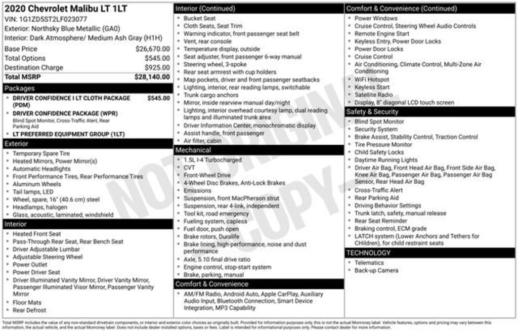 Welcome to Chuck Stevens Chevrolet located on HWY 31 South, Bay Minette Alabama. We are home of Lifetime Powertrain Warranty. A Lifetime Powertrain Warranty at no additional cost.Grab a great deal with our low-price guarantee on this 2020 Chevrolet Malibu LT while we still have it. At Chuck Stevens Chevrolet our Pre-Owned vehicles have been fully inspected and reconditioned by a certified technician. The Blue 2020 Chevrolet Malibu LT with Jet Black interior is a wonderful choice.The online price includes a $2,500 Cash Down or trade equity. To qualify, customers must trade in a vehicle with a minimum appraised value of $2,500 or Cash Down. All prices reflect dealership financing and include a $1,000 finance coupon. See dealer for full details. Driver Confidence I LT Cloth Package Driver Confidence Package Preferred Equipment Group 1LT 6-Speaker Audio System Feature Premium audio system: Chevrolet Infotainment 3 Radio: Chevrolet Infotainment 3 System SiriusXM Radio Automatic temperature control Front dual zone A/C 8-Way Power Driver Seat Adjuster Remote keyless entry Steering wheel mounted audio controls Emergency communication system: OnStar and Chevrolet connected services capable Rear Park Assist Lane Change Alert w/Side Blind Zone Alert Rear Cross Traffic Alert Apple CarPlay/Android Auto Telescoping steering wheel Tilt steering wheel Heated Driver & Front Passenger Seats 17 Aluminum WheelsThis 2020 Chevrolet Malibu LT delivers an impressive combination of style, technology, and efficiency. With its sleek exterior design, the Malibu makes a bold statement on the road. Under the hood, the 1.5L DOHC engine paired with the CVT transmission provides a smooth, responsive driving experience while delivering an EPA-estimated 29 MPG city and 36 MPG highway.Inside, the Malibu's cabin is filled with premium features that elevate your daily commute. The Chevrolet Infotainment 3 system with a 8 color touchscreen provides seamless smartphone integration through Apple CarPlay and Android Auto. Dual-zone automatic climate control ensures everyone rides in comfort, while the heated front seats and power driver's seat offer personalized support. Advanced safety technologies like Rear Park Assist, Lane Change Alert with Side Blind Zone Alert, and Rear Cross Traffic Alert help you navigate with confidence.Whether you're looking for a practical daily driver or a stylish family sedan, this 2020 Chevrolet Malibu LT is an exceptional choice. With its impressive features, efficient performance, and sleek design, it's sure to exceed your expectations. We invite you to experience the Malibu for yourself and schedule a test drive at Chuck Stevens Chevrolet today.LIFETIME POWERTRAIN WARRANTY PROGRAM is included at no additional charge for all vehicles that have less than 80,000 miles. It is one of the most comprehensive powertrain warranty programs in the market. See dealer for details.