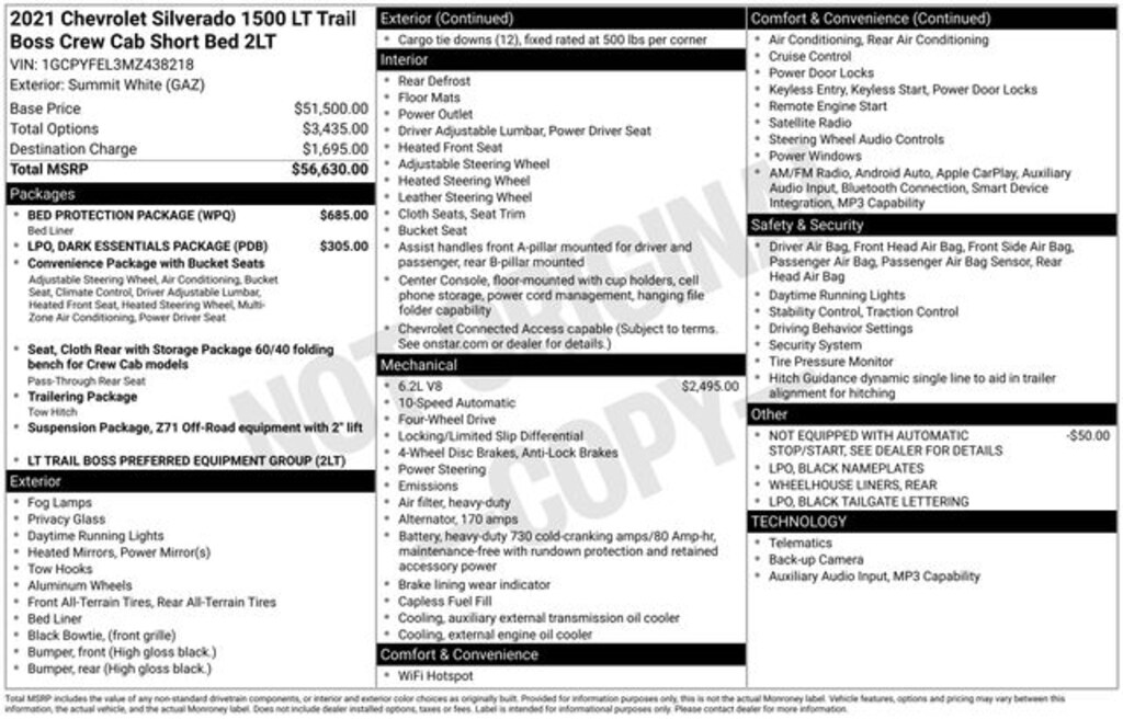 2021 Chevrolet Silverado 1500 LT Trail Boss 4D Crew Cab LT Trail Boss Summit White 4WD EcoTec3 6.2L V8 10-Speed Automatic