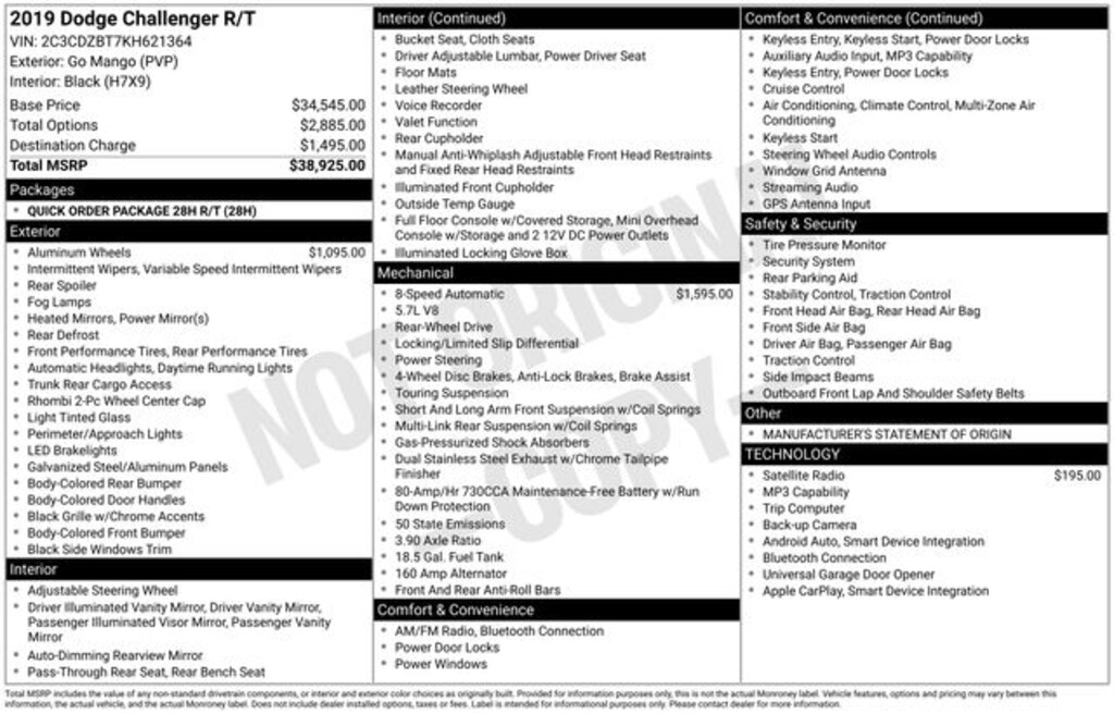 Welcome to Chuck Stevens Dodge Chrysler Jeep Ram Fiat located on HWY 31 South, Bay Minette Alabama. We are home of The Lifetime Powertrain Warranty at no additional cost. Grab a great deal with our low-price guarantee on this 2019 Dodge Challenger R/T while we still have it. At Chuck Stevens CDJRF our Pre-Owned vehicles have been fully inspected and reconditioned by a certified technician. The Orange 2019 Dodge Challenger R/T with Houndstooth Cloth Performance Seats interior is a wonderful choice.