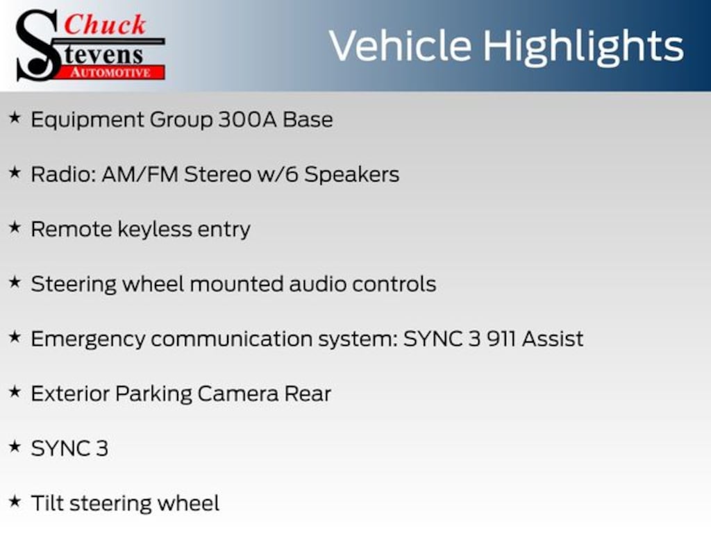 3.31 Axle Ratio, Alloy wheels, AppLink/Apple CarPlay and Android Auto, Emergency communication system: SYNC 3 911 Assist, Equipment Group 300A Base, Exterior Parking Camera Rear, Radio: AM/FM Stereo w/6 Speakers, Remote keyless entry, Steering wheel mounted audio controls, SYNC 3, Telescoping steering wheel, Tilt steering wheel, Wheels: 17" Silver Painted Aluminum.