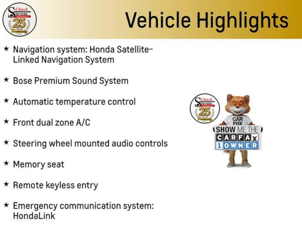 - Integrated navigation : Honda Satellite-Linked Navigation System integrated navigation system with voice activation