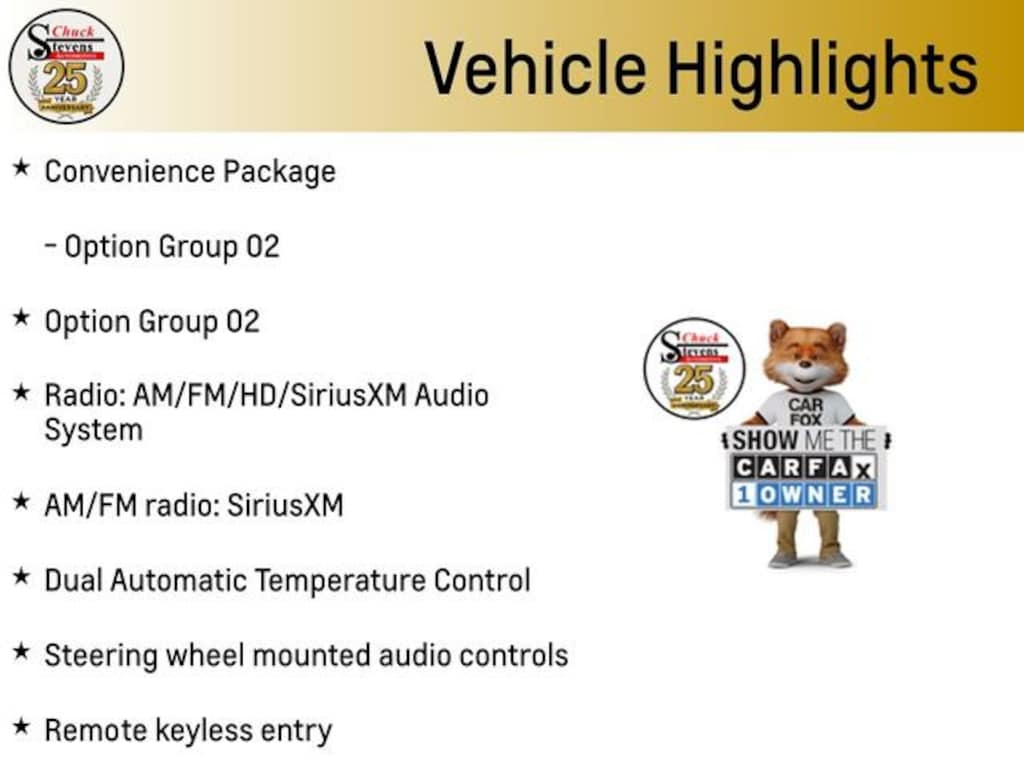 10.25 Digital Instrument Cluster, Alloy wheels, AM/FM radio: SiriusXM, Apple CarPlay & Android Auto, Auto-Dimming Interior Mirror w/Homelink, Convenience Package, Digital Key, Dual Automatic Temperature Control, Fully automatic headlights, Hands-Free Power Liftgate w/Auto-Open, Illuminated entry, Leather-Wrapped Shift Knob, Leather-Wrapped Steering Wheel, LED Interior Lights (Room, Map), Option Group 02, Power driver seat, Power Sunroof, Radio: AM/FM/HD/SiriusXM Audio System, Remote keyless entry, Security system, Spoiler, Stain & Odor Resistant Cloth Seat Trim, Steering wheel mounted audio controls, Telescoping steering wheel, Tilt steering wheel, Turn signal indicator mirrors, Ultrasonic Rear Occupant Alert, Variably intermittent wipers, Wheels: 19 x 7.5J Machine-Face Finish Alloy, Wireless Phone Charging.