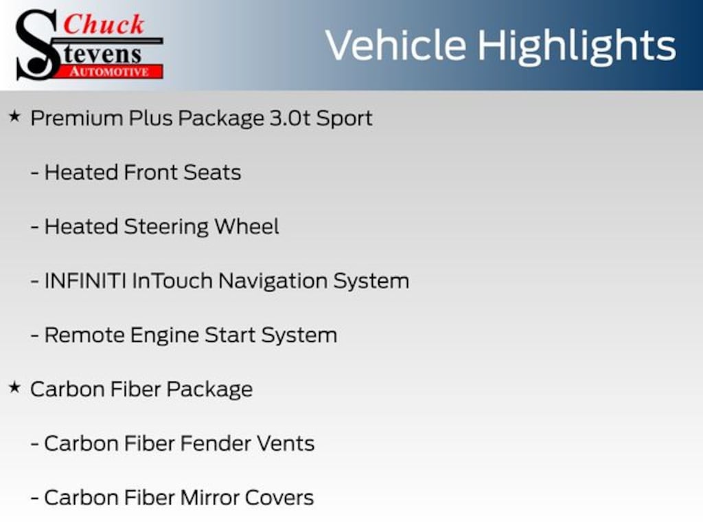 Carbon Fiber Fender Vents, Carbon Fiber Mirror Covers, Carbon Fiber Package, Carbon Fiber Rear Spoiler, Heated Front Seats, Heated Steering Wheel, INFINITI InTouch Navigation System, Premium Plus Package 3.0t Sport, Remote Engine Start System.