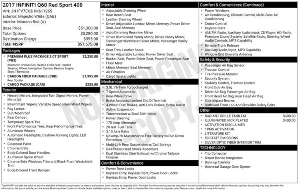 Take advantage of our low-price guarantee on this 2017 INFINITI Q60. This Q60 comes finished in Majestic White with a Monaco Red interior, making it a great choice for your next vehicle.