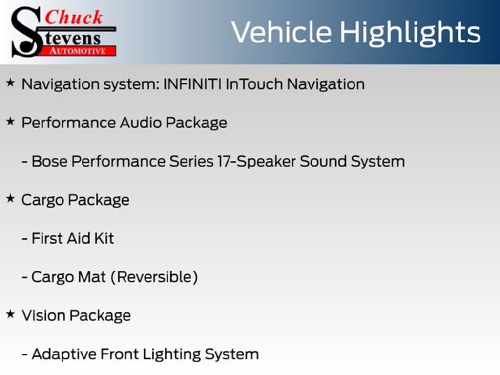 For the ultimate audio experience, the Performance Audio Package adds the renowned Bose Performance Series sound system, featuring 17 strategically placed speakers that deliver immersive, concert-hall quality sound. The Cargo Package further enhances the QX60's versatility with a host of organizational and protective accessories, ensuring your belongings stay secure and protected.