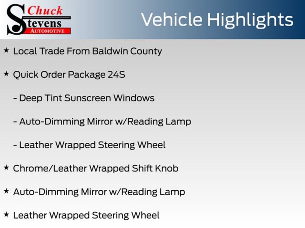 Local Trade From Baldwin County, Auto-Dimming Mirror w/Reading Lamp, Chrome/Leather Wrapped Shift Knob, Deep Tint Sunscreen Windows, Leather Wrapped Steering Wheel, Quick Order Package 24S.