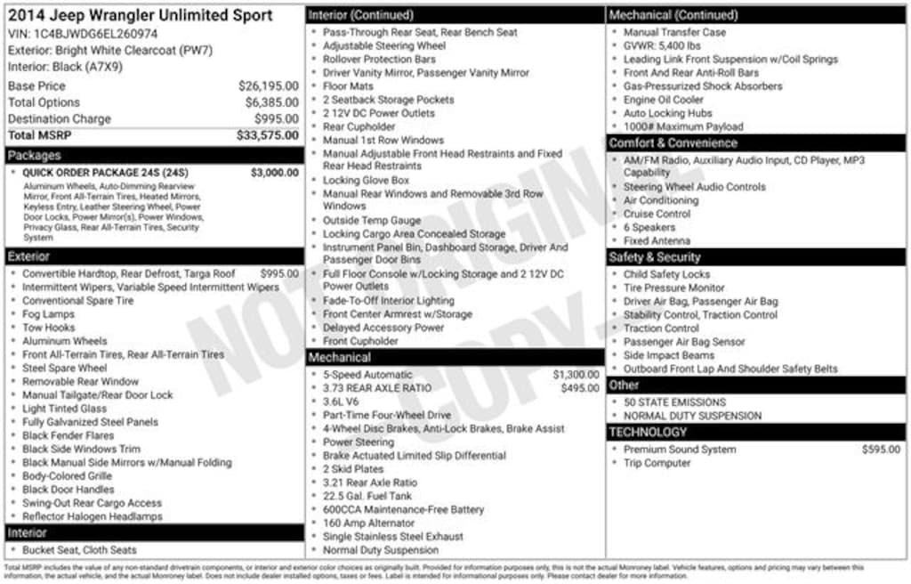 Take advantage of our low-price guarantee on this 2014 Jeep Wrangler. This Wrangler comes finished in Bright White Clearcoat with a Black interior, making it a great choice for your next vehicle.