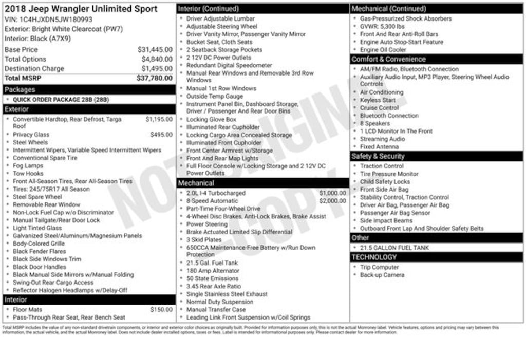 Take advantage of our low-price guarantee on this 2018 Jeep Wrangler. This Wrangler comes finished in Bright White Clearcoat with a Black interior, making it a great choice for your next vehicle.