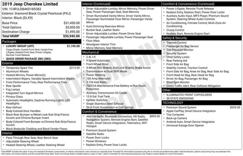 2019 Jeep Cherokee Limited 4D Sport Utility Limited Diamond Black Crystal Pearlcoat FWD 2.4L I4 9-Speed 948TE Automatic