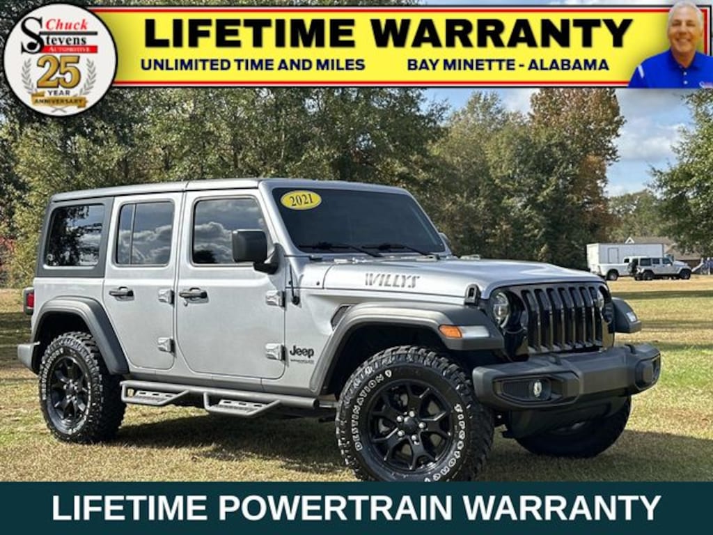 Welcome to Chuck Stevens Dodge Chrysler Jeep Ram Fiat located on HWY 31 South, Bay Minette Alabama. We are home of The Lifetime Powertrain Warranty at no additional cost. Grab a great deal with our low-price guarantee on this 2021 Jeep Wrangler Unlimited Willys while we still have it. At Chuck Stevens CDJRF our Pre-Owned vehicles have been fully inspected and reconditioned by a certified technician. The Silver 2021 Jeep Wrangler Unlimited Willys with Black interior is a wonderful choice.
