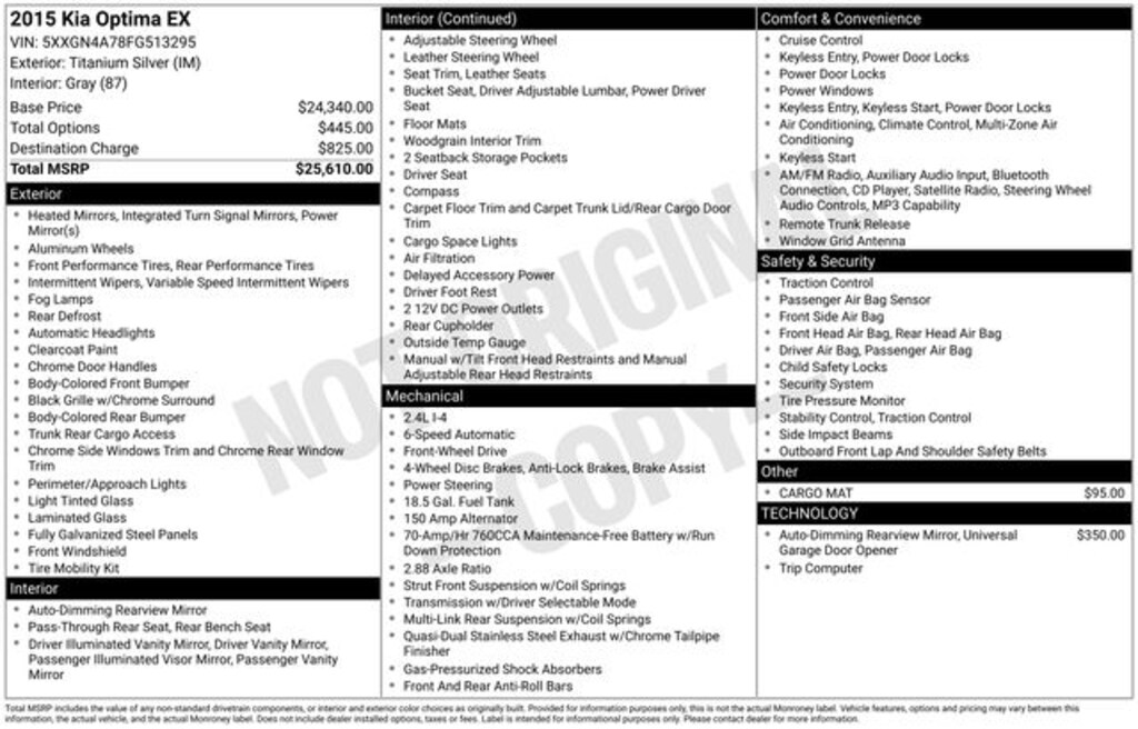 Take advantage of our low-price guarantee on this 2015 Kia Optima. This Optima comes finished in Titanium Silver with a Gray interior, making it a great choice for your next vehicle.