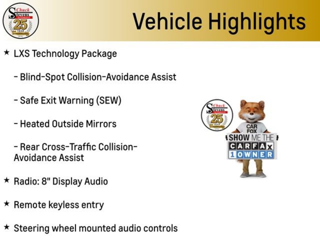 16 x 6.5J Alloy Wheels, Alloy wheels, Blind-Spot Collision-Avoidance Assist, Front Bucket Seats, Fully automatic headlights, Heated Outside Mirrors, LXS Technology Package, Radio: 8 Display Audio, Rear Cross-Traffic Collision-Avoidance Assist, Remote keyless entry, Safe Exit Warning (SEW), Steering wheel mounted audio controls, Telescoping steering wheel, Tilt steering wheel.