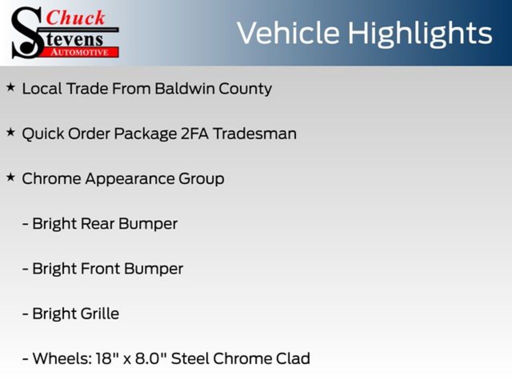 Local Trade From Baldwin County, 1-Yr SiriusXM Radio Service, 40/20/40 Split Bench Seat, Bright Front Bumper, Bright Grille, Bright Rear Bumper, Carpet Floor Covering, Chrome Appearance Group, Cloth 40/20/40 Bench Seat, For More Info, Call 800-643-2112, Front & Rear Floor Mats, Popular Equipment Group, Quick Order Package 2FA Tradesman, Rear Folding Seat, Remote Keyless Entry, SiriusXM Satellite Radio, Wheels: 18" x 8.0" Steel Chrome Clad.