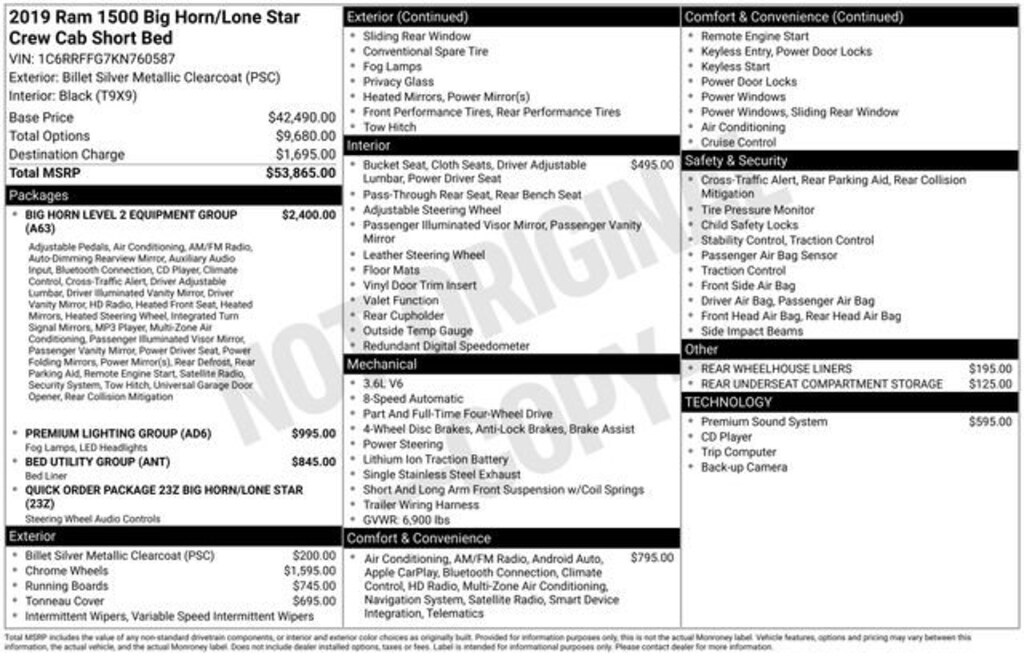 Welcome to Chuck Stevens Chevrolet located on HWY 31 South, Bay Minette Alabama. We are home of Lifetime Powertrain Warranty. A Lifetime Powertrain Warranty at no additional cost. Grab a great deal with our low-price guarantee on this 2019 Ram 1500 while we still have it. At Chuck Stevens Chevrolet our Pre-Owned vehicles have been fully inspected and reconditioned by a certified technician. The Billet Silver Metallic Clearcoat 2019 Ram 1500 with Black Cloth interior is a terrific choice.The online price includes a $2,500 Cash Down or trade equity. To qualify, customers must trade in a vehicle with a minimum appraised value of $2,500 or Cash Down. All prices reflect dealership financing and include a $1,000 finance coupon. See dealer for full details.Recent Arrival!2019 Ram 1500 Big Horn/Lone Star Billet Silver Metallic Clearcoat 4D Crew Cab Big Horn/Lone Star 4WD 3.6L V6 24V VVT 8-Speed AutomaticLIFETIME POWERTRAIN WARRANTY PROGRAM is included at no additional charge for all vehicles that have less than 80,000 miles. It is one of the most comprehensive powertrain warranty programs in the market. See dealer for details.
