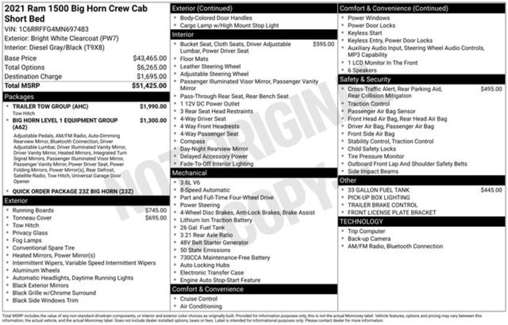 2021 Ram 1500 Big Horn/Lone Star 4D Crew Cab Big Horn/Lone Star Bright White Clearcoat 4WD 3.6L V6 24V VVT 8-Speed Automatic