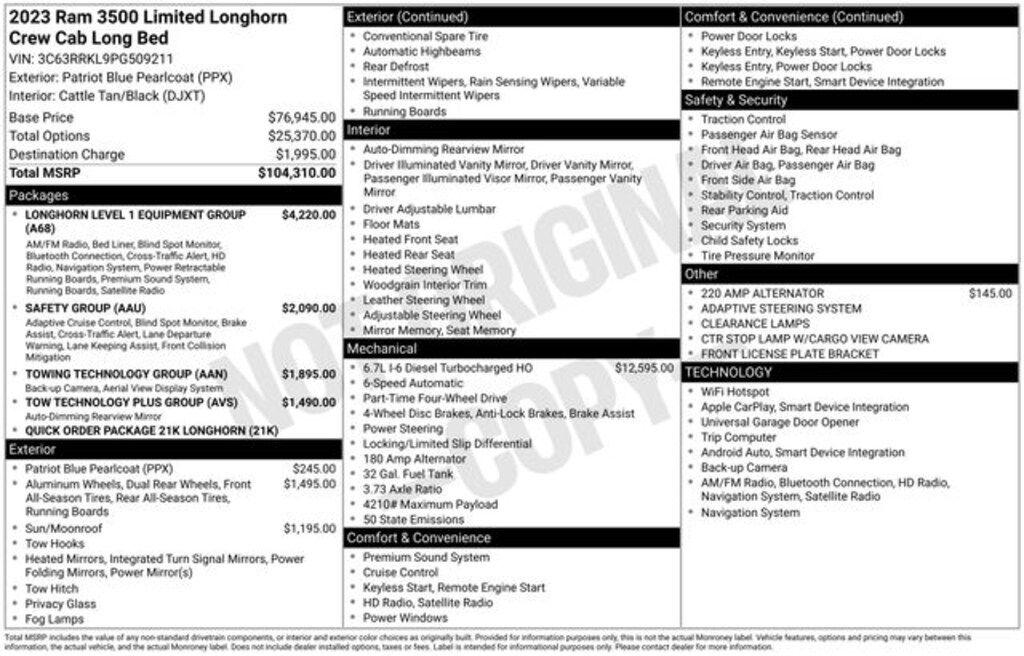 Welcome to Chuck Stevens Dodge Chrysler Jeep Ram Fiat located on HWY 31 South, Bay Minette Alabama. We are home of The Lifetime Powertrain Warranty at no additional cost. Grab a great deal with our low-price guarantee on this 2023 Ram 3500 while we still have it. At Chuck Stevens our Pre-Owned vehicles have been fully inspected and reconditioned by a certified technician. The Patriot Blue Pearlcoat 2023 Ram 3500 with Cattle Tan/Black Leather interior is a fantastic choice.