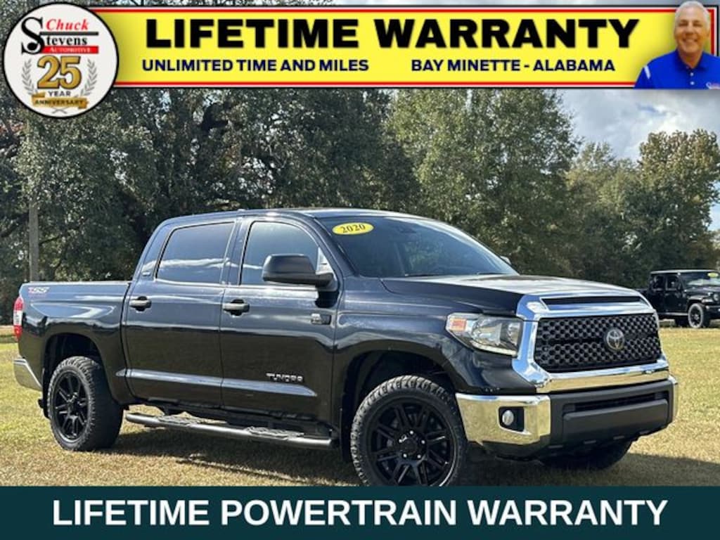 Welcome to Chuck Stevens Dodge Chrysler Jeep Ram Fiat located on HWY 31 South, Bay Minette Alabama. We are home of The Lifetime Powertrain Warranty at no additional cost. Grab a great deal with our low-price guarantee on this 2020 Toyota Tundra SR5 while we still have it. At Chuck Stevens CDJRF our Pre-Owned vehicles have been fully inspected and reconditioned by a certified technician. The Black 2020 Toyota Tundra SR5 with Black interior is a wonderful choice.