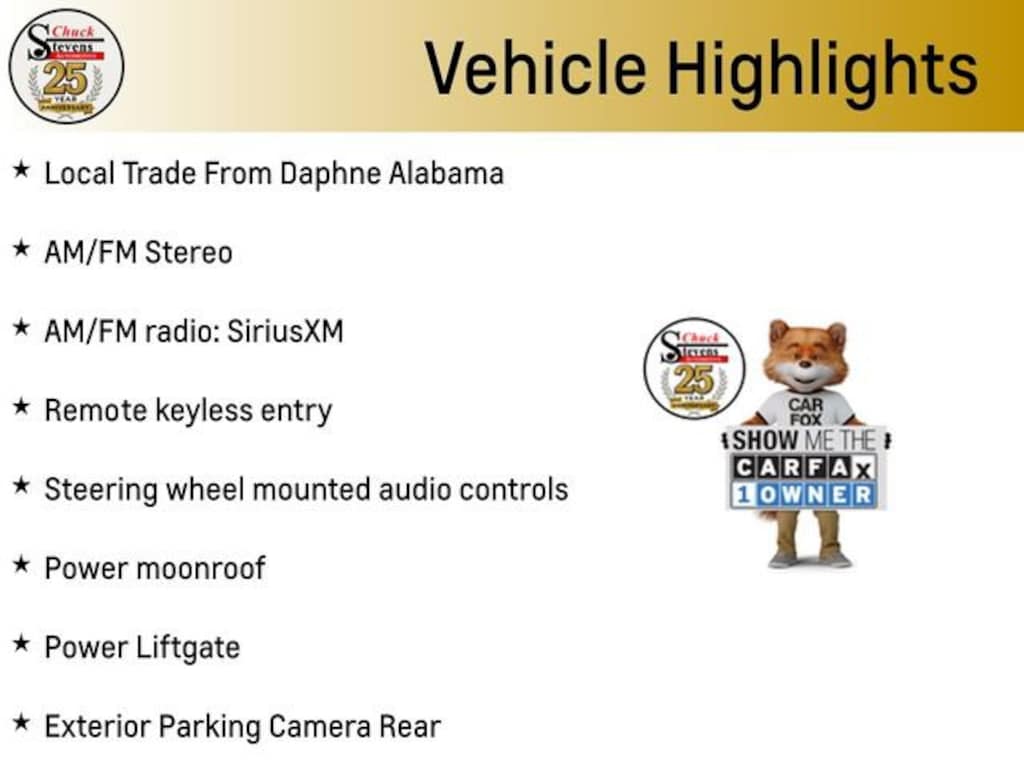 Local Trade From Daphne Alabama, Alloy wheels, AM/FM radio: SiriusXM, AM/FM Stereo, Apple CarPlay/Android Auto, Exterior Parking Camera Rear, Front Bucket Seats, Fully automatic headlights, Power Liftgate, Power moonroof, Remote keyless entry, SofTex Seat Trim, Steering wheel mounted audio controls, Telescoping steering wheel, Tilt steering wheel, Variably intermittent wipers, Wheels: 17 5-Spoke Silver Alloy.